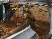 Endlich gibt es die hinteren Seitenteile wieder im Originalstyle... Der deformierte Querträger vorne unter dem Kühler wird erneuert. Entlacken und Grundieren des Bodys...