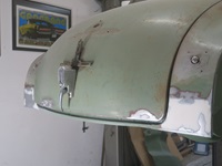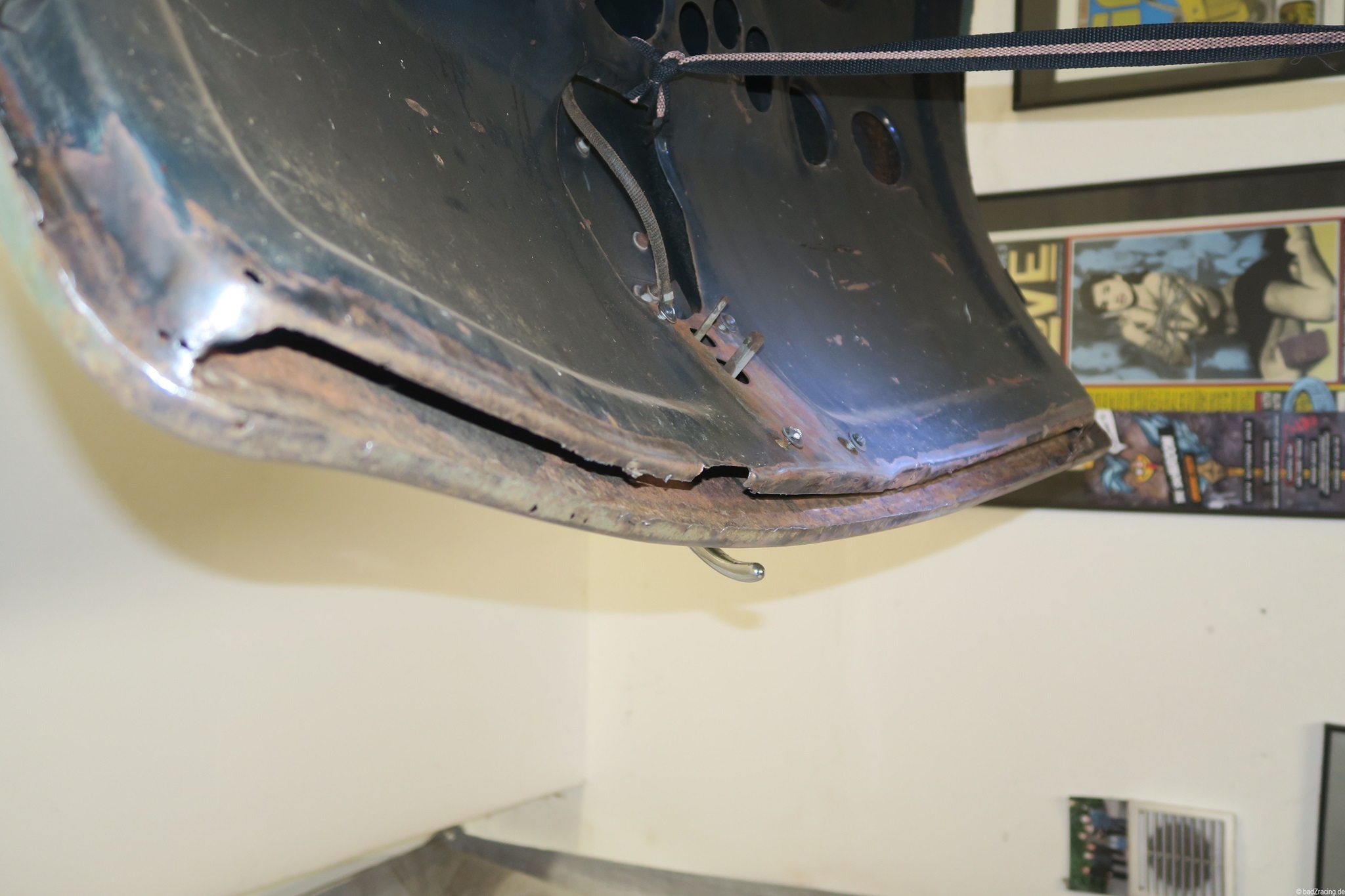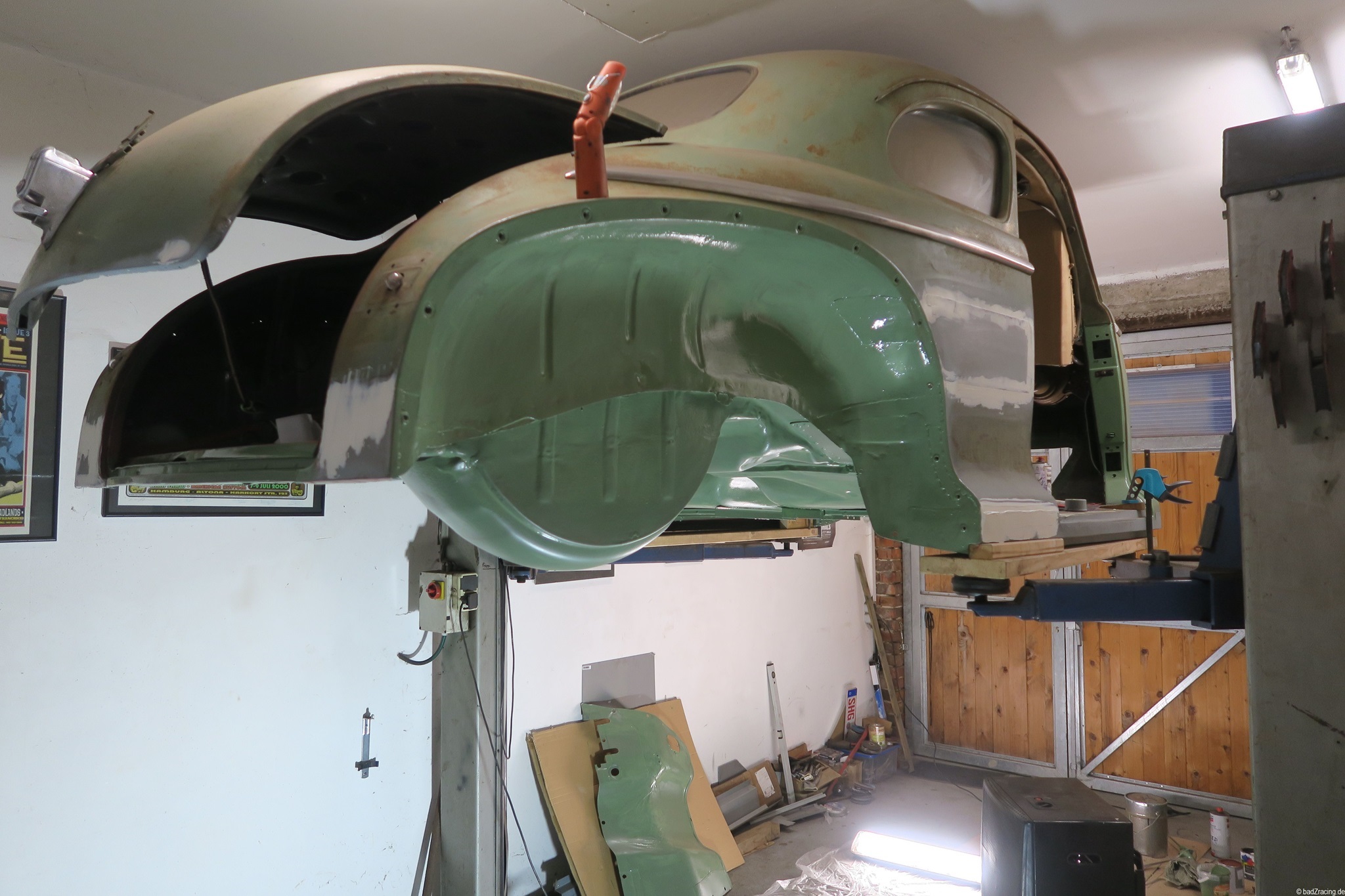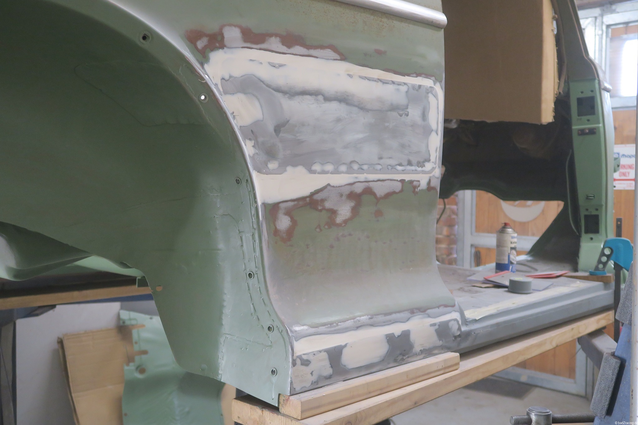 OK, die Heckklappe hat Probleme, aber das kann man ja auch später ordentlich machen. Also erstmal eine Notreparatur. Und nachdem der Farbton angemischt ist aus Mattschwarz und Resedagrün 6011 kann endlich mal was lackiert/gestrichen werden...